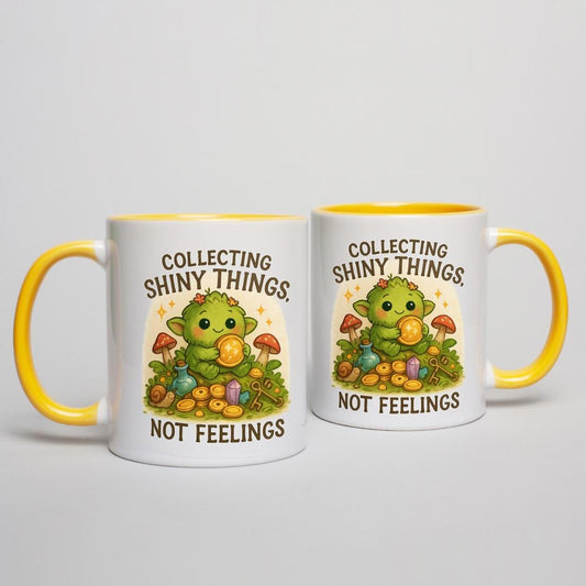 Collecting Shiny Things Not Feelings Mug | Goblincore Coffee Cup | Cute Moss Sprite Accent Mug | Funny Cottagecore Gift Idea